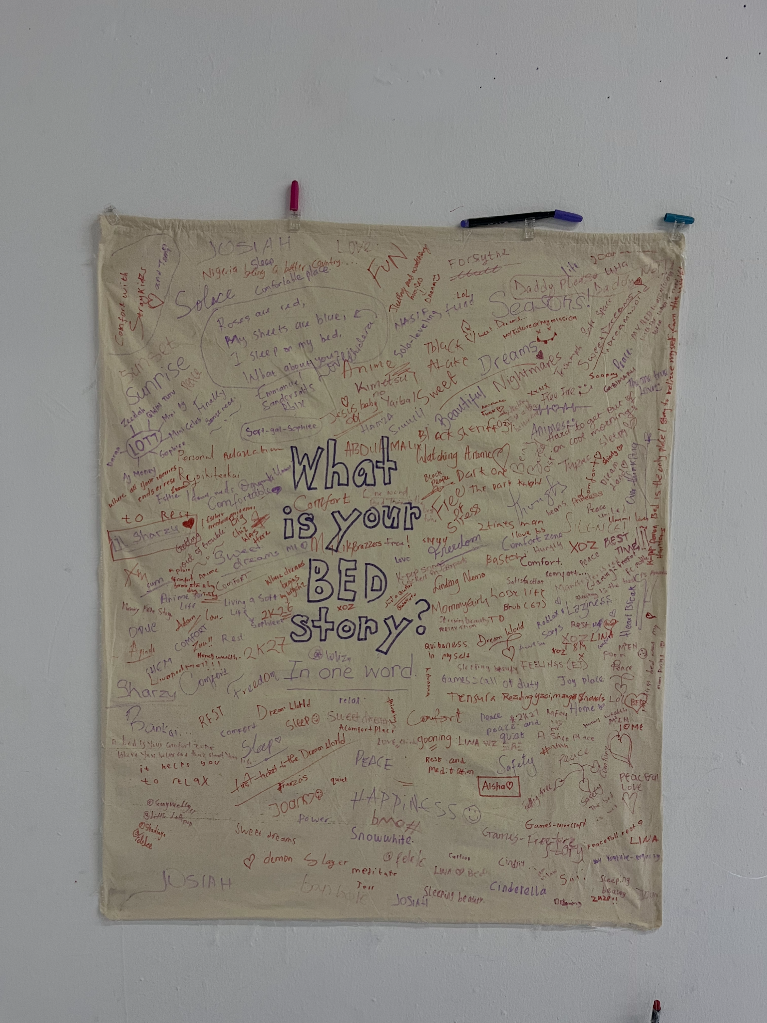 - Participatory Activities: including a recording booth for guests’ reflections, writing surfaces where visitors share words they associate with their beds, visual presentations of recordings, an audio loop and thematic workshops.