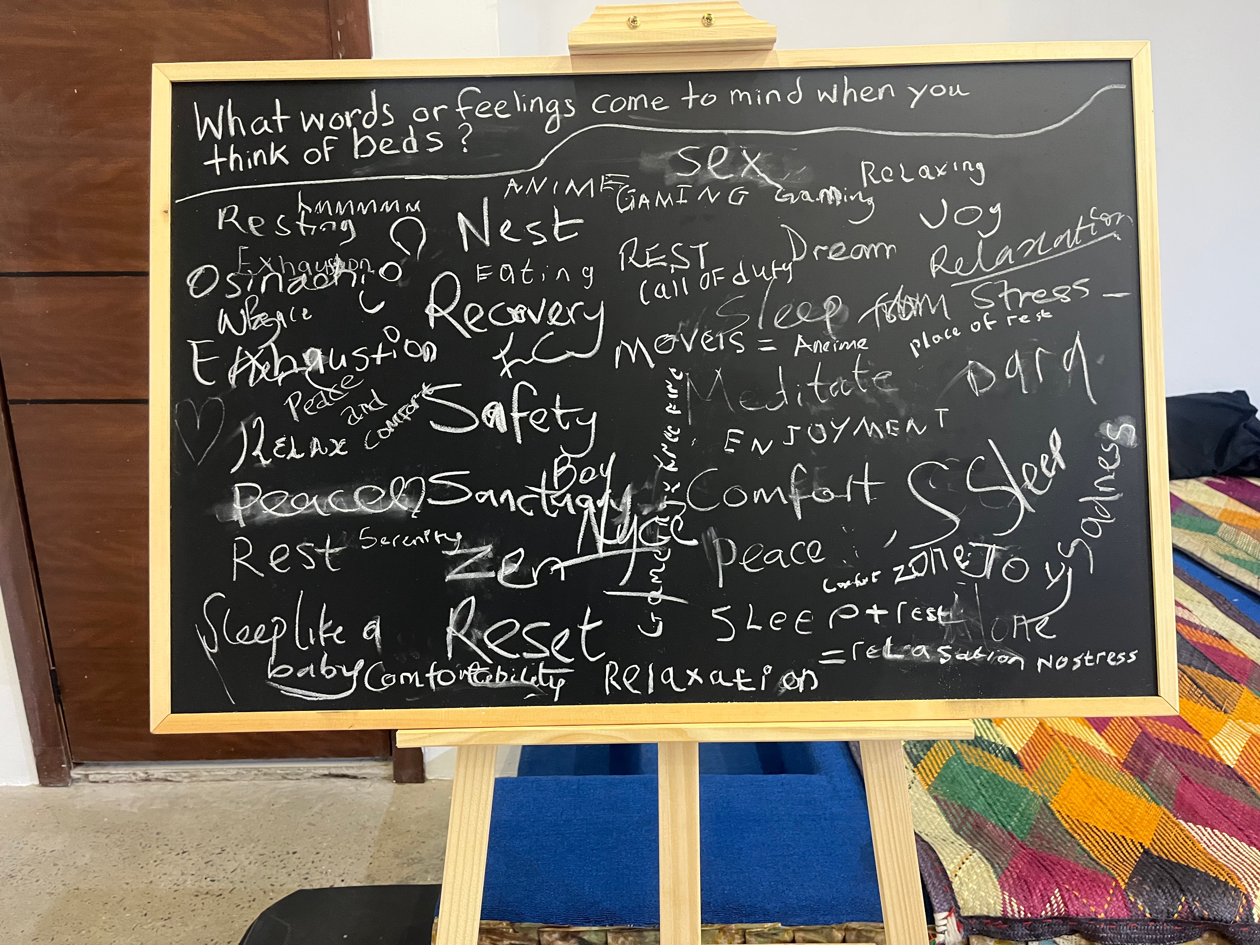 Our two exhibitions so far have been deeply revealing. We learned a great deal. In Lagos, many guests told Helen and I, and also through conversations, notes, and recordings, that they would never see a bed in the same way again. Similar reflections were shared by visitors in Abuja, including responses that approached beds from design and spatial perspectives, like this one, and a TV reporter’s detailed video description of the Lagos exhibition.